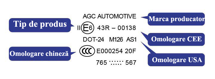 - Conformitatea cu standardul european de calitate și siguranță ECE R43. Atenție: dacă pe geamul de producție chineză lipsește omologarea chineză, înseamnă că lotul de geamuri a fost fabricat pentru piața europeană sau americană, despre ce atestă semnele de pe geam.